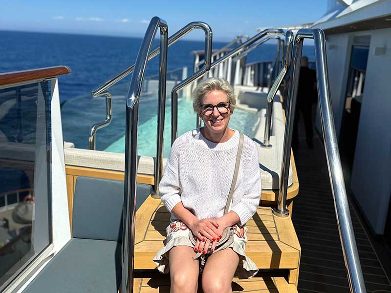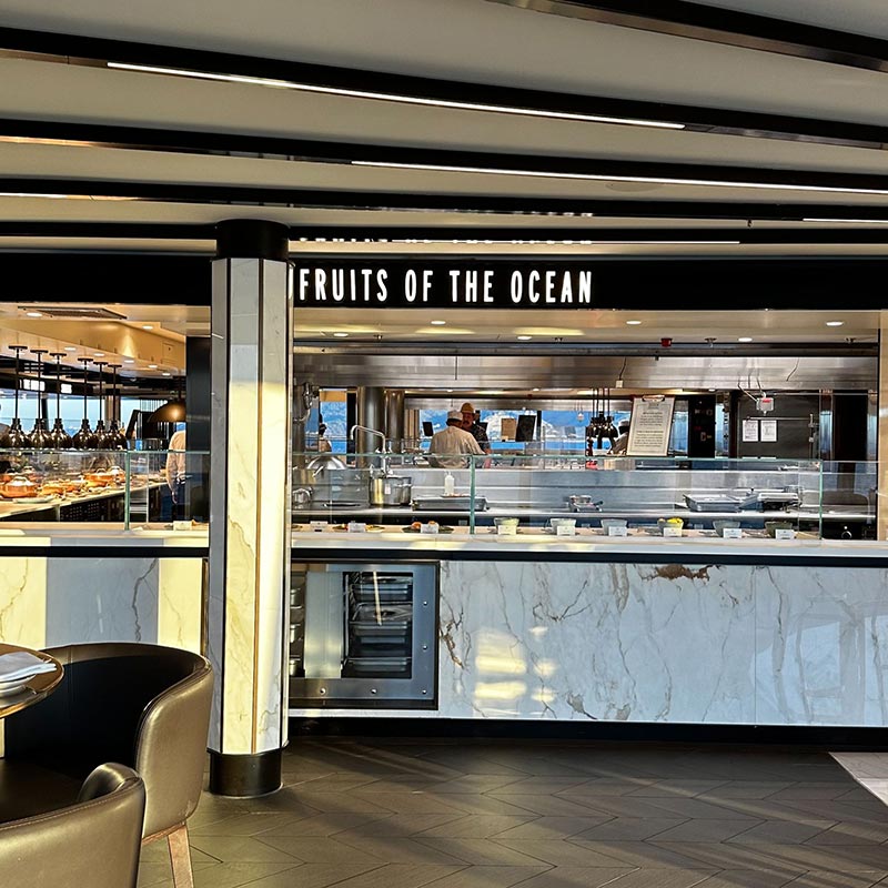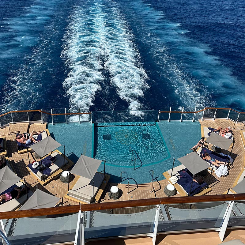 Der fünfte Tag auf See war ein Geschenk. Ich begann mit Yoga auf dem Deck, lunche später ausgiebig im Emporium Marketplace, das wie ein elegantes Food Hall-Konzept funktioniert –mit Live-Kochstationen, feinsten Delikatessen aus aller Welt, Kochstationen und einer Weinauswahl, die keine Wünsche offenließ – Blick aufs offene Meer, und verbrachte den Nachmittag lesend in einer schattigen Cabana am Pool. Die Ruhe, das Platzangebot und die entspannte Atmosphäre an Bord machten diesen Tag zu einem echten Rückzugsort – entschleunigt und tief erholsam. Und das abendliche Dinner im Steakrestaurant Marble & Co hat den Tag zu einem perfekten letzten Urlaubstag gemacht.