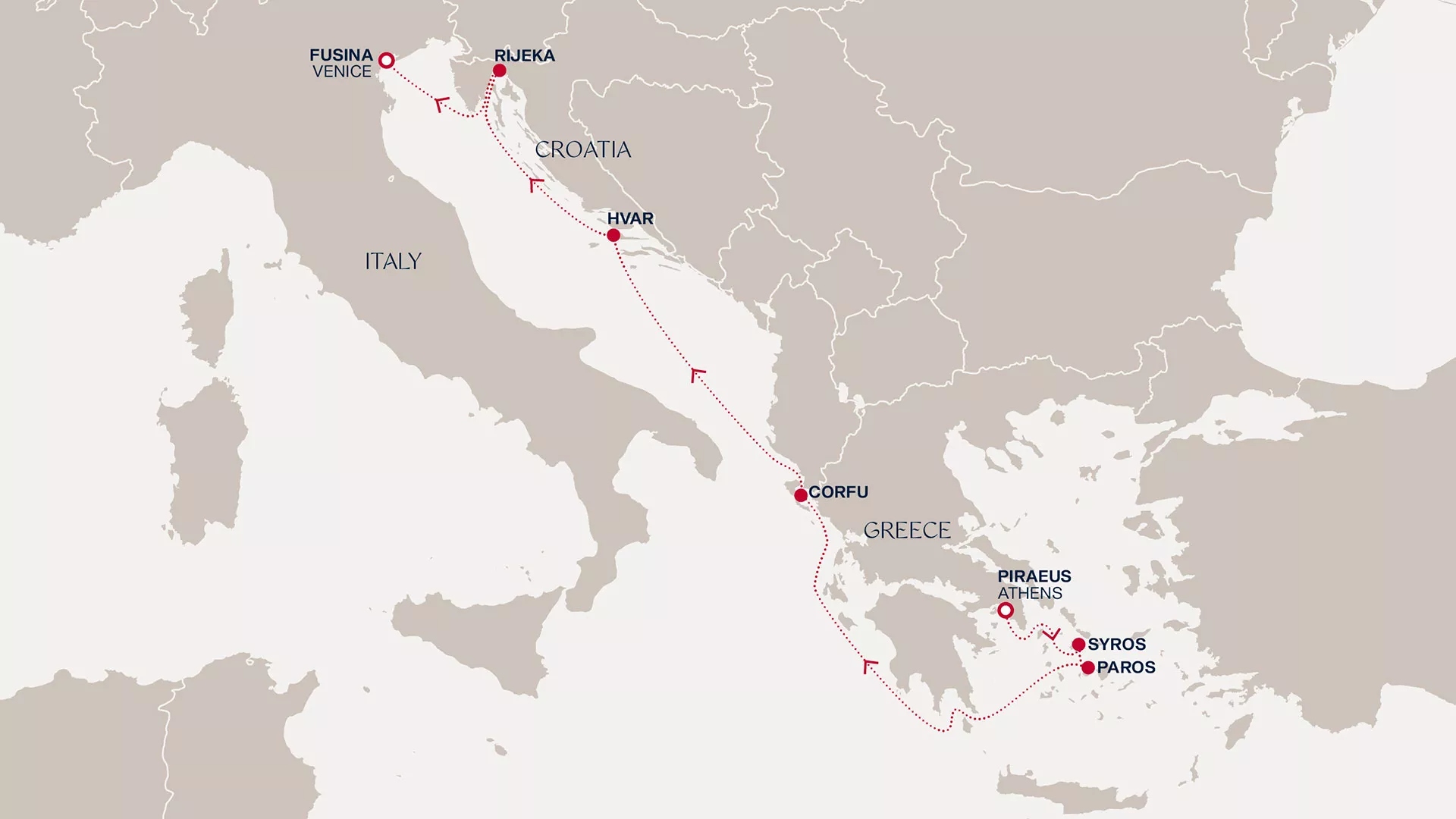 Von den antiken und modernen Wundern, die Athens pulsierendes Stadtleben prägen, geht es weiter nach Syros, wo wir neoklassizistische Eleganz an sonnenverwöhnten Küsten genießen. Schlendern Sie durch malerische Dörfer auf Paros und entdecken Sie die inspirierende Atmosphäre der ionischen Sehenswürdigkeiten auf Korfu, bevor Sie die lebhaften Attraktionen Hvars und die venezianische Burg erkunden. Lassen Sie sich von der barocken Schönheit und den Kieselstränden Rijekas verzaubern und tauchen Sie schließlich ein in den Zauber des goldenen Venedigs.